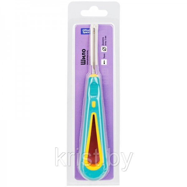 Канцелярское шило используется для прошивки документов и прокалывания бумаги. Оснащено ушком для продевания нити. Пластиковая прорезиненная рукоятка (составная, зеленый + желтый). Диаметр иглы 3 мм, длина иглы 40 мм, никелированное покрытие. Общая длина 140 мм, обеспечивает прокалывание до 30 листов бумаги. Упаковка - блистер с европодвесом.