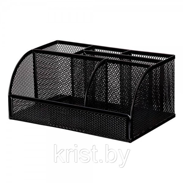 Стильная и удобная подставка для канцелярских мелочей. Подходит для использования в офисах, школах и в быту. Предназначена для хранения канцелярских мелочей, пишущих принадлежностей и листков для записей. Выполнена из металлической сетки. Имеет 7 отделений.