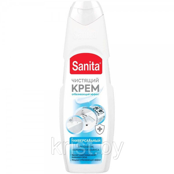 Универсальное чистящее средство Санита с отбеливающим эффектом Сила Белого подходит для очистки кухонных поверхностей и ванной комнаты, плит, кафеля, металлических, эмалированных поверхностей, нержавеющая сталь, фаянс, керамической плитки, кранов, посуды, рабочих поверхностей. Способ применения: встряхните крем, распределите по поверхности с помощью влажной губки. Очистите, смойте водой. Меры предосторожности: перед использованием ознакомиться с маркировкой продукта. Использовать перчатки и средства защиты лица и глаз. Использовать только в хорошо вентилируемом помещении. После работы тщательно вымыть руки. При попадании в глаза: осторожно промыть глаза водой в течение нескольких минут. Снять контактные линзы, если Вы ими пользуетесь и если это легко сделать. Продолжить промывание глаз. Если раздражение глаз не проходит, обратиться за медицинской помощью, по возможности показать маркировку продукта. При возникновении раздражения кожи обратиться за медицинской помощью, по возможности показать маркировку продукта. Хранить в недоступном для детей месте. Состав: Предохранять от попадания прямых солнечных лучей.