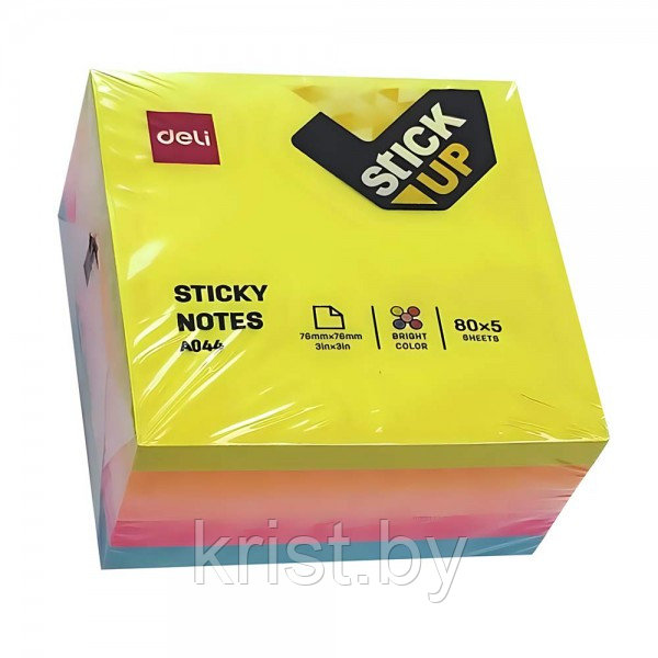 Блок самоклеящейся бумаги для заметок Deli размером 76 х 76 мм изготовлен из бумаги. Подходит для наклеивания на различные типы поверхностей. Упаковка 400 стикеров, 5 цветов — жёлтый, розовый, тёмно-розовый, голубой, зелёный. Упакован в прозрачную плёнку с возможностью быстрого открытия.