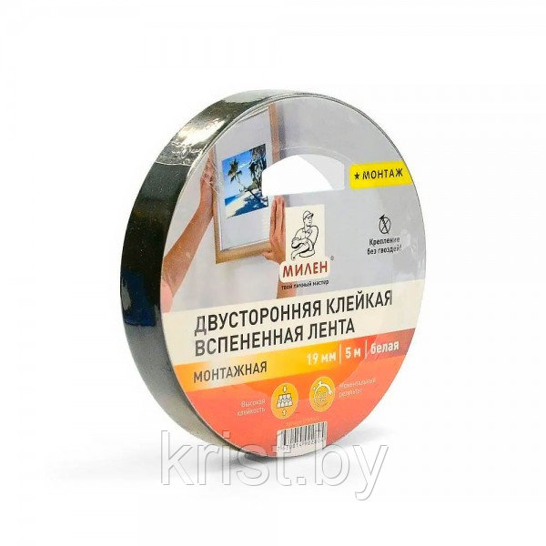 Клейкая лента двусторонняя МИЛЕН на вспененной основе применяется при ремонте, строительстве и интерьерных работах, в быту и на производстве. Используется в качестве альтернативы клею, гвоздям и шурупам.ОсобенностиУскорить технологию монтажа, сделать ее более простой и чистой.Сократить процент отходов и брака.Улучшить внешний вид конструкций.Сохранить качество зеркала на длительный срок, т.к. клей не разрушает со временемметаллизированную поверхность.Обеспечить прочность и надежность крепления зеркал.Применяется:для крепления и монтажа зеркал; для соединения предметов и конструкций из металла, пластика, стекла, керамики, дерева и картона;для крепления бордюров, плинтусов, табличек, рамок, элементов декора и т.д.ПреимуществаУдобный размер.Индивидуальная упаковка.Высокая клейкость.Моментальный результат.